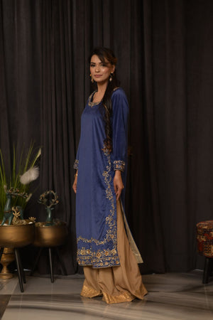 Indulge in the opulence of our Enchanted Nights Ink Blue Velvet Ensemble, a masterpiece that intertwines luxury with artistry. Crafted with meticulous detail, this ensemble is designed to elevate your style to ethereal heights.