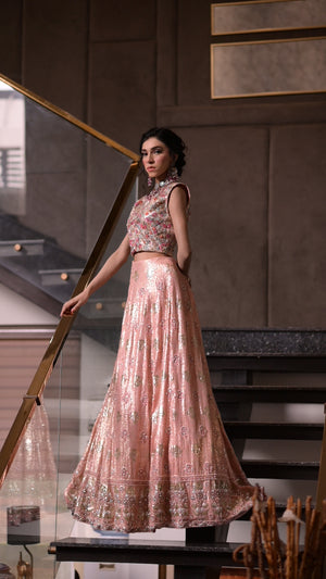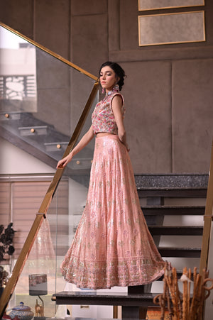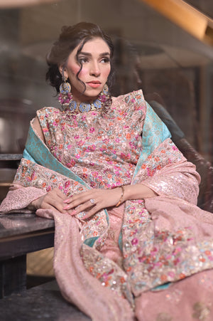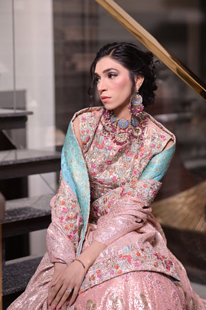 Beautiful baby pink & firozi lehnga choli with intricate machine embroidry & handwork.Paired with a beautifully crafted shawl , perfect for weddings , festivals & special occasions.