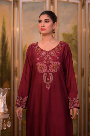 Step into timeless elegance with this Regal Maroon long shirt, & trouser a masterpiece of intricate Hand work