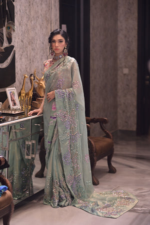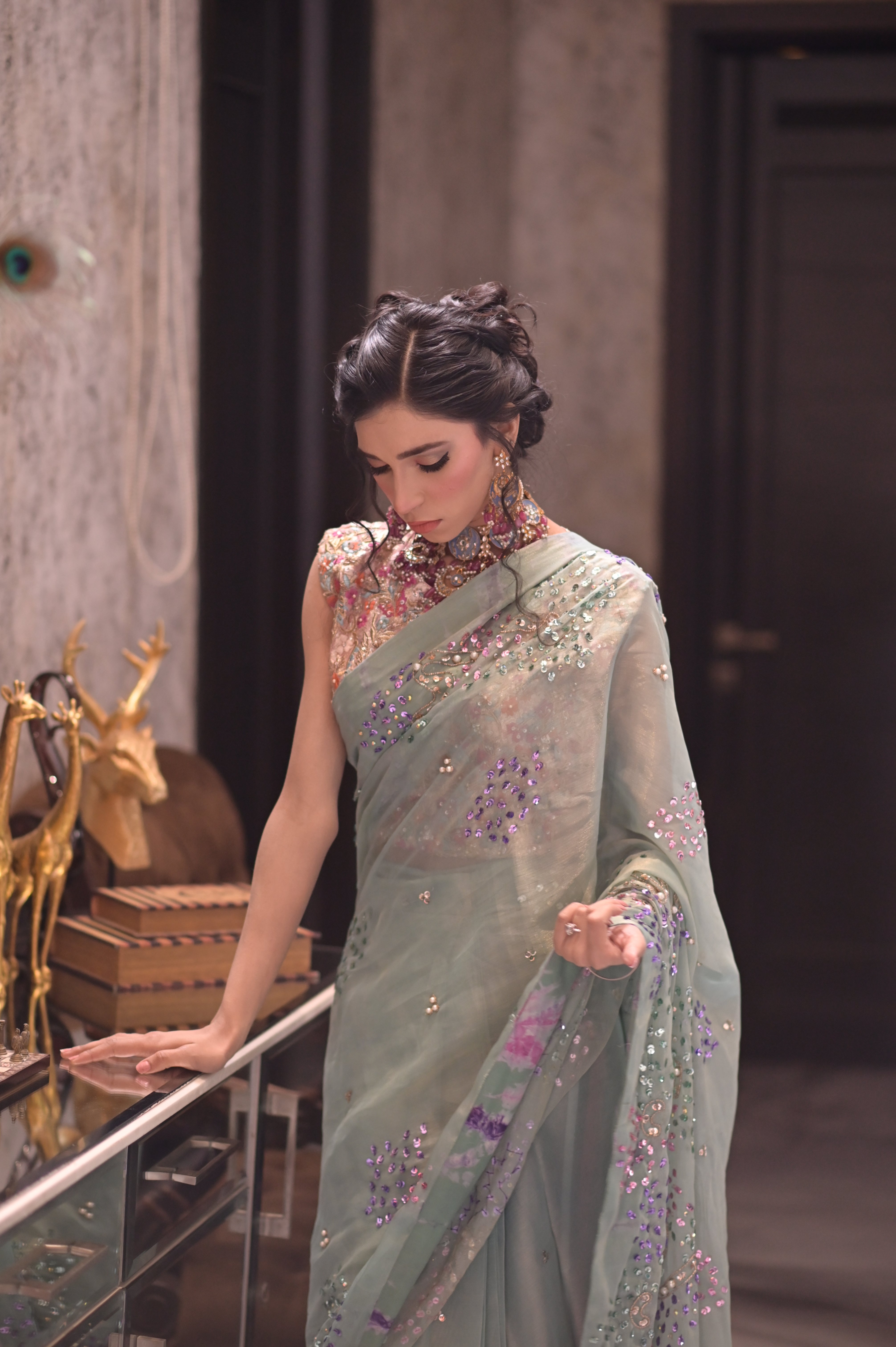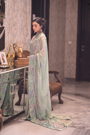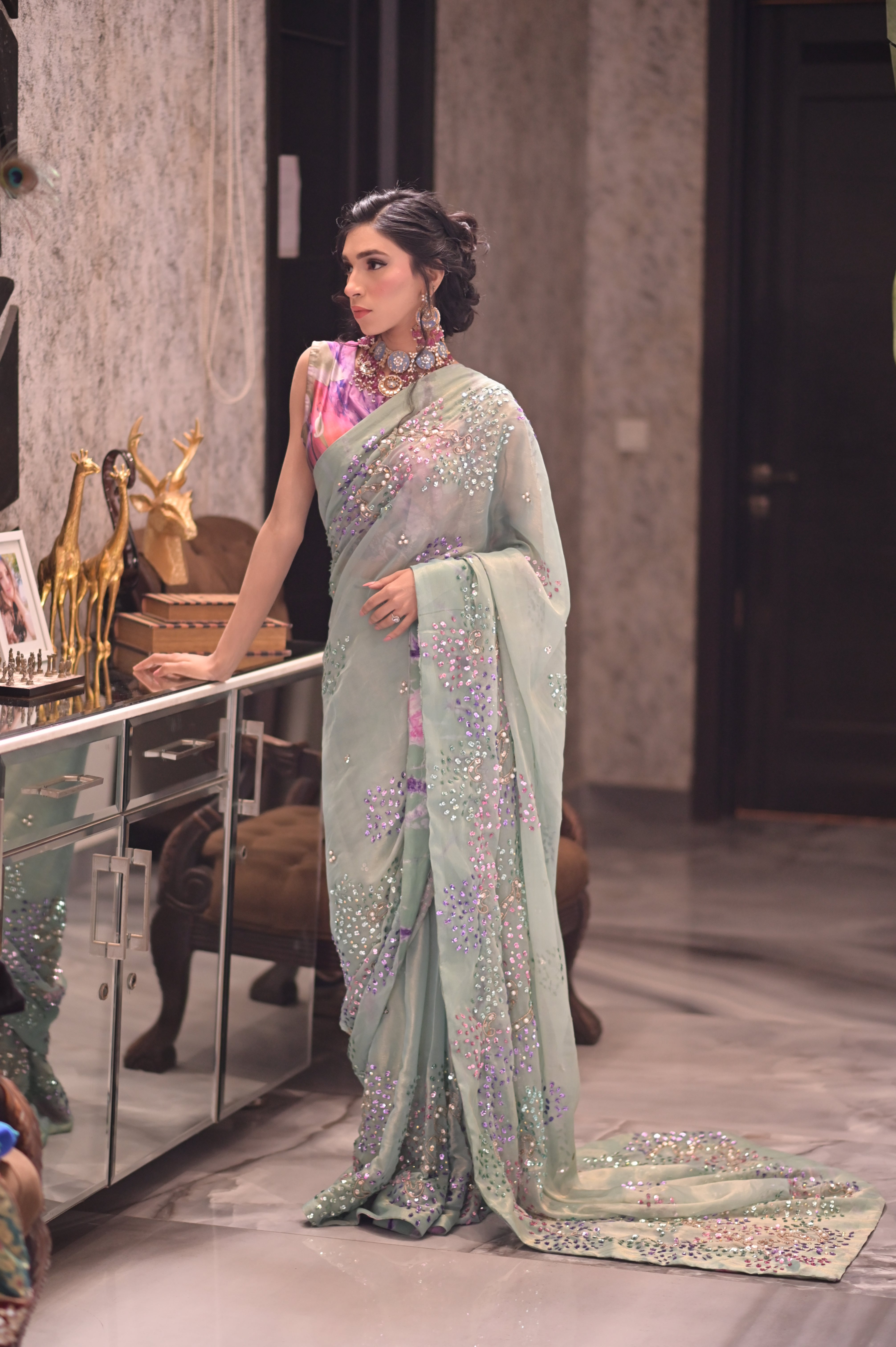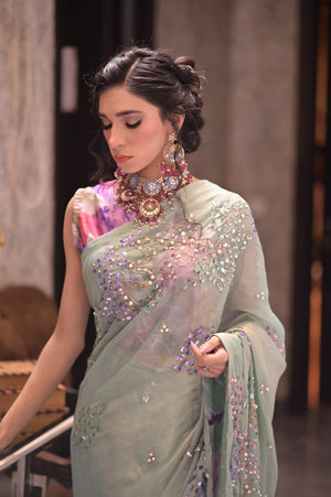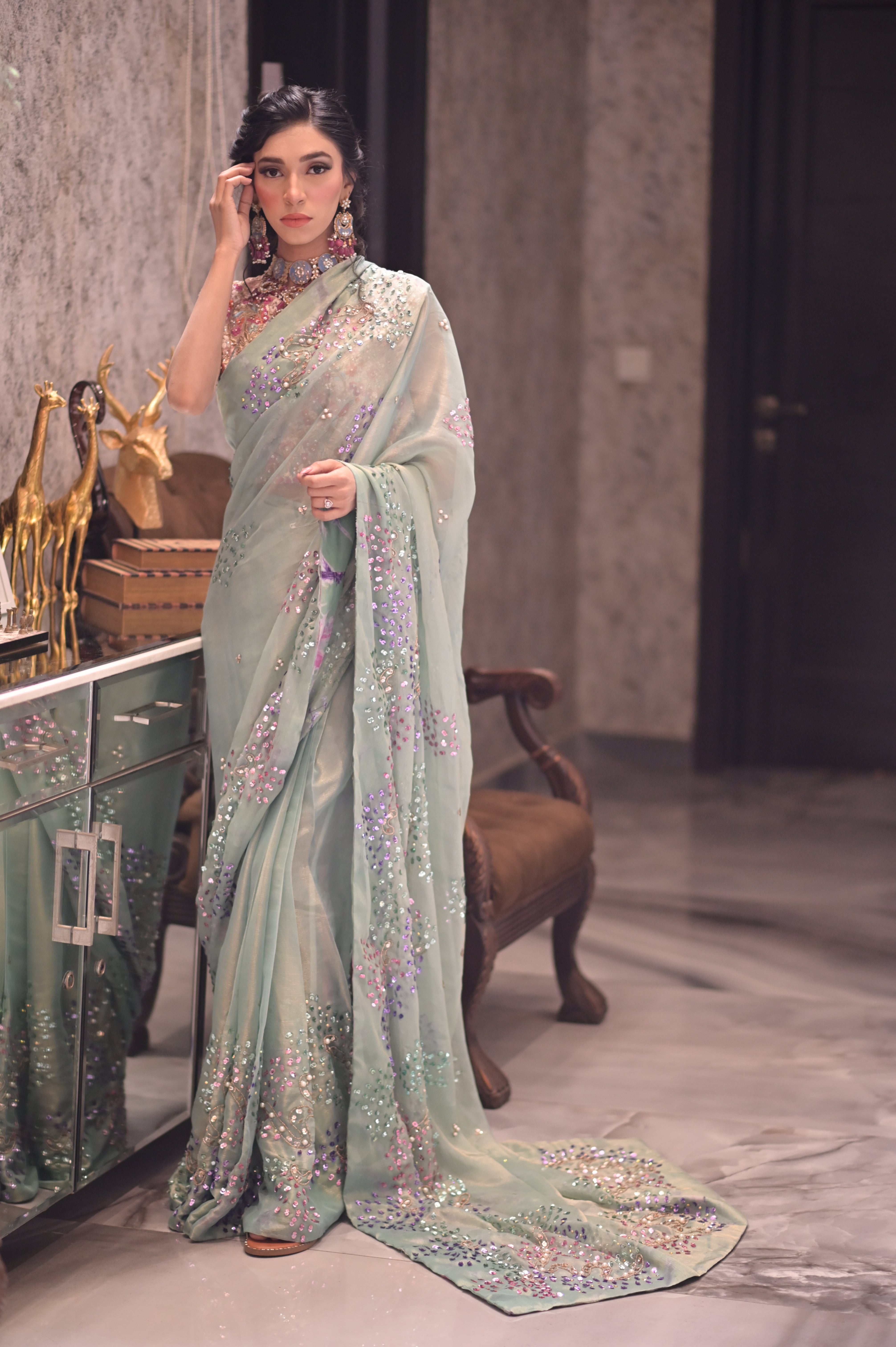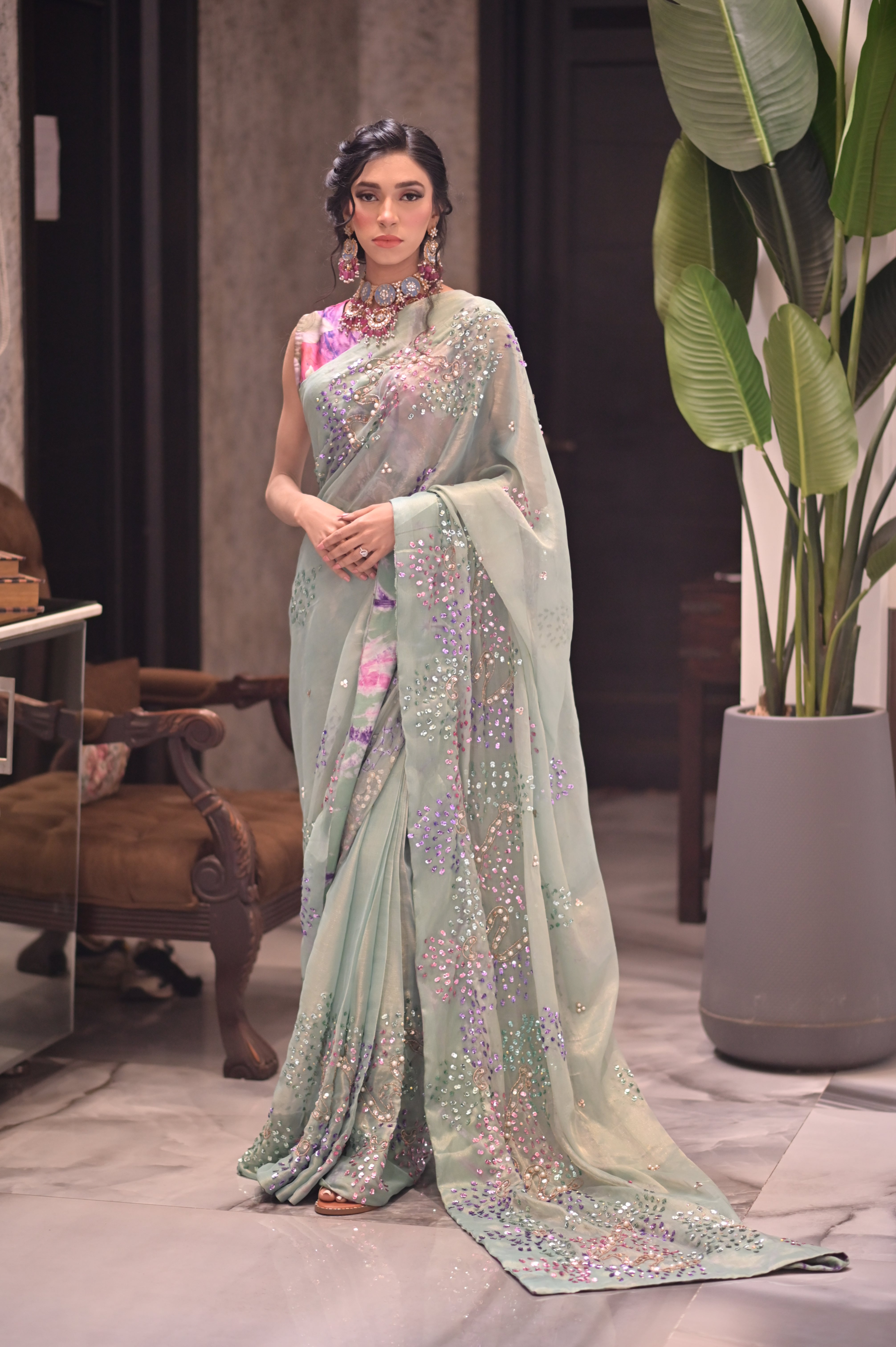 The subtle sheen of the silky chiffon catches the light , while the sparkling sitara add the touch of sophistication & glamour .