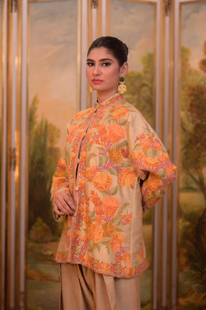 Elevate your style with this Multi-Color Art Dress, an exquisite outfit designed to bring together elegance, comfort, and artistry. Featuring a Tan Short Gown, this piece is adorned with vibrant multi-color embroidery